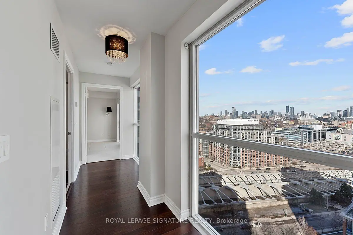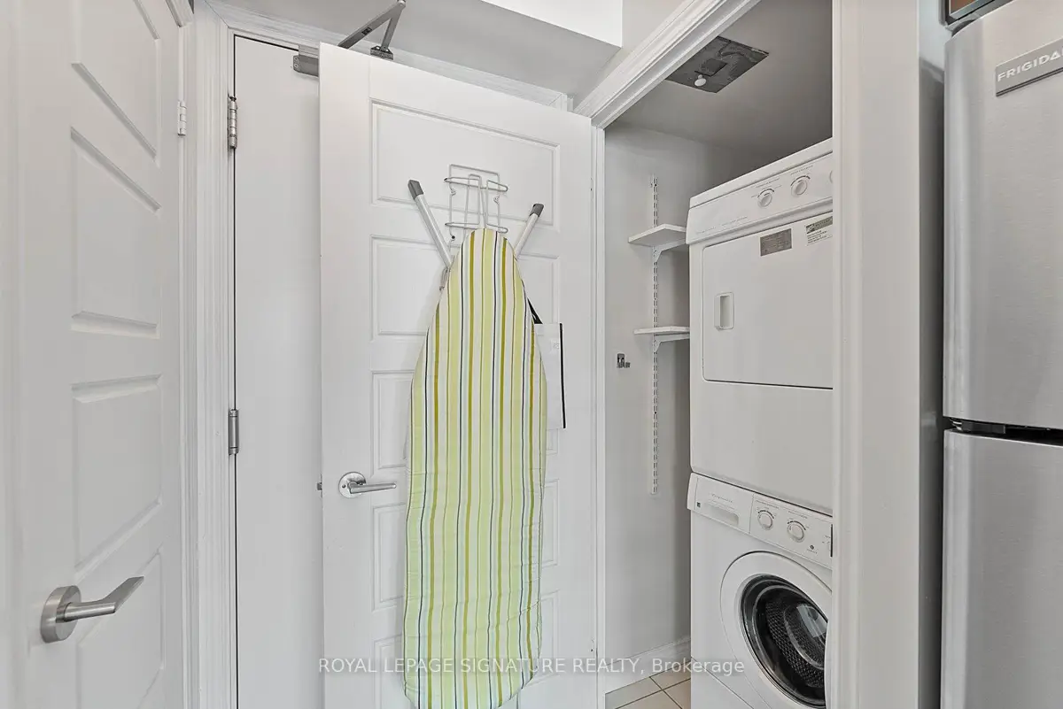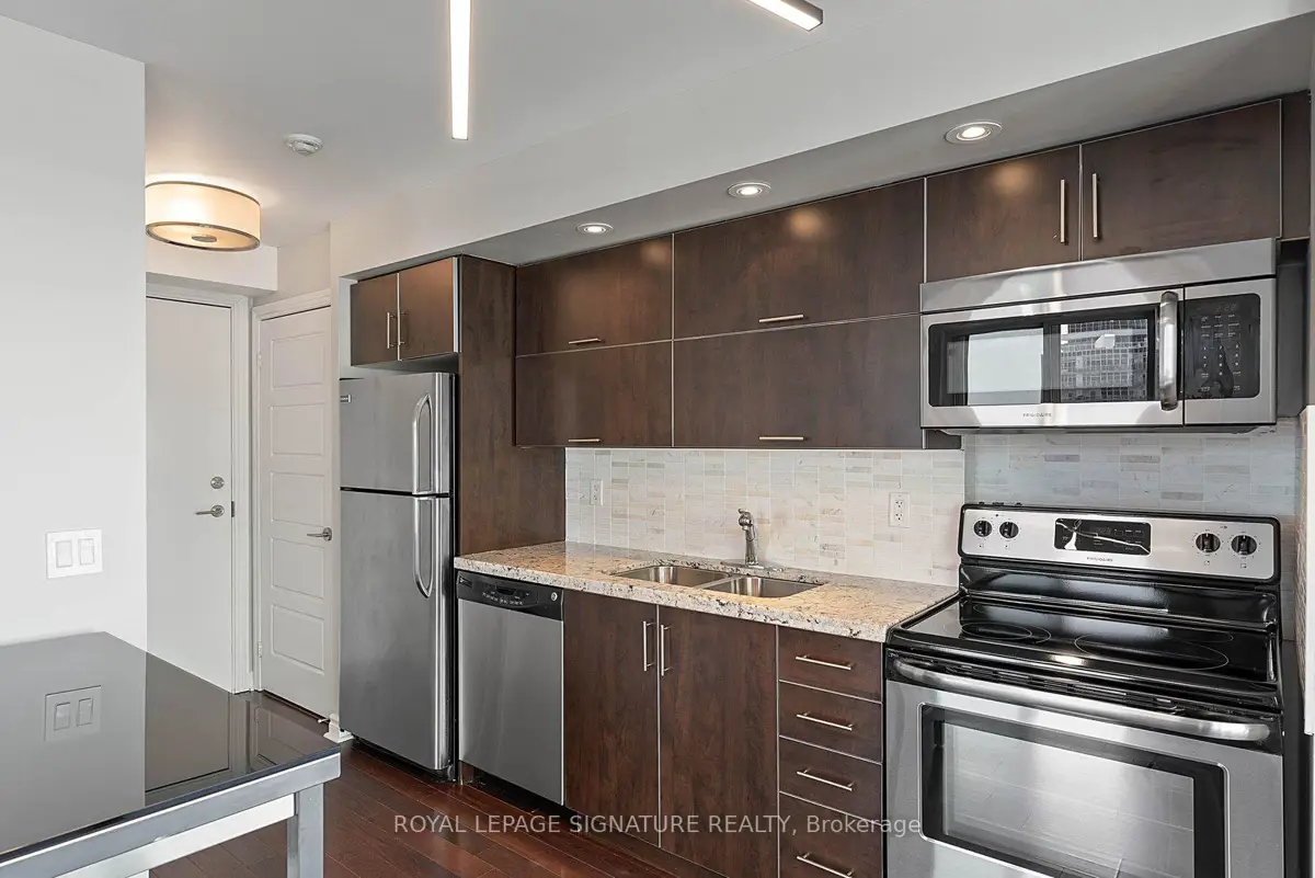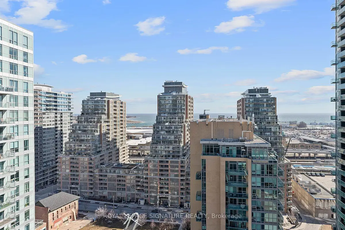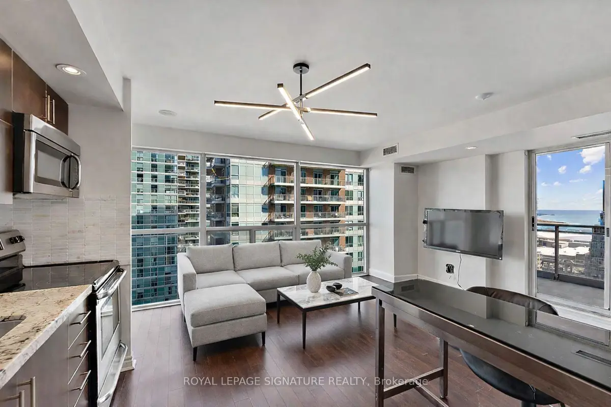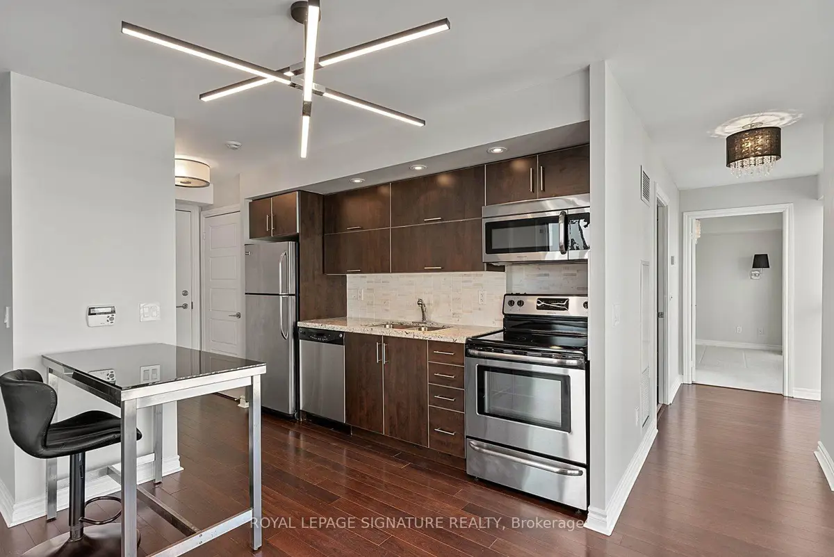 Experience stunning, postcard-worthy views of Lake Ontario and breathtaking sunrises from this thoughtfully designed 1-bedroom + den corner suite - featuring a functional split layout with no wasted space! Freshly painted throughout and professionally deep cleaned, offering a pristine, move-in ready space. Floor-to-ceiling windows line the entire south and east wings of this unit, flooding the space with natural light while framing panoramic lake and city skyline views. The modern eat-in kitchen is equipped with granite countertops, a subway tile backsplash, and full-sized stainless steel appliances. The bright living and dining area easily accommodates a full dining table and entertainment setup, making it ideal for both everyday living and hosting. Walk out to the expansive 111+ sqft balcony that spans the entire south side of the suite, creating a seamless indoor-outdoor living experience. The open-concept den, located just off the main living/dining space, features an IKEA PAX storage system and is perfectly suited for a comfortable work-from-home setup. Privately positioned at the end of the hallway, the spacious primary bedroom, with freshly professionally cleaned carpet, offers floor-to-ceiling windows and a spacious walk-in closet. The 4-piece spa-inspired washroom has a freshly re-caulked 2-in-1 shower/soaker tub with hand-held wand, stylish tile floors, a mirrored medicine cabinet, vanity with under-sink storage and wall-mounted mirror. Sheer roller blinds in the living/dining/kitchen were professionally cleaned. Includes one parking space and a storage locker! World-Class Amenities in 3x Buildings: 3x Gyms, Indoor Pool, Whirlpool Hot Tub & Steam Rooms, Landscaped Outdoor Lounge Area with Bbq's, Sports Lounge with Billiards Table, Party Room, Theatre Room, Meeting Rooms, Guest Suites & Concierge In 50 Lynn Williams. Steps To Pedestrian Bridge!
