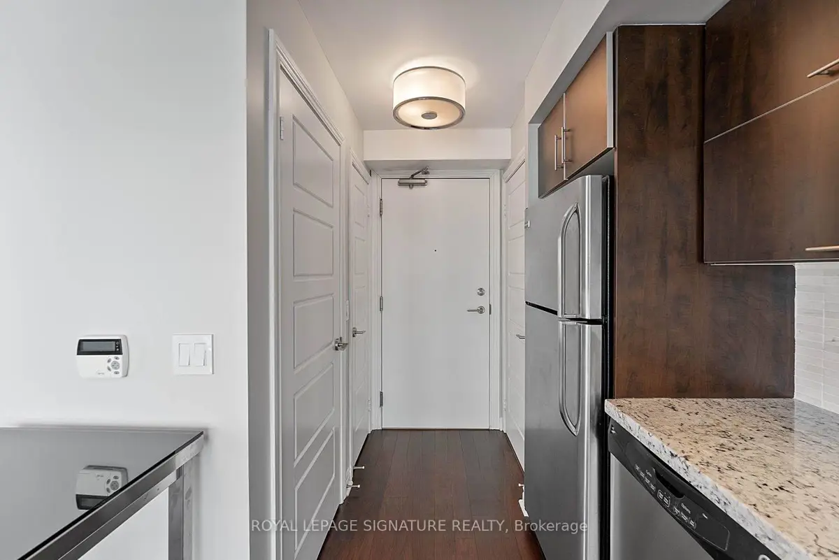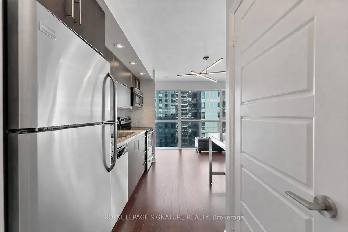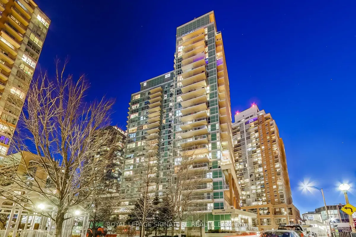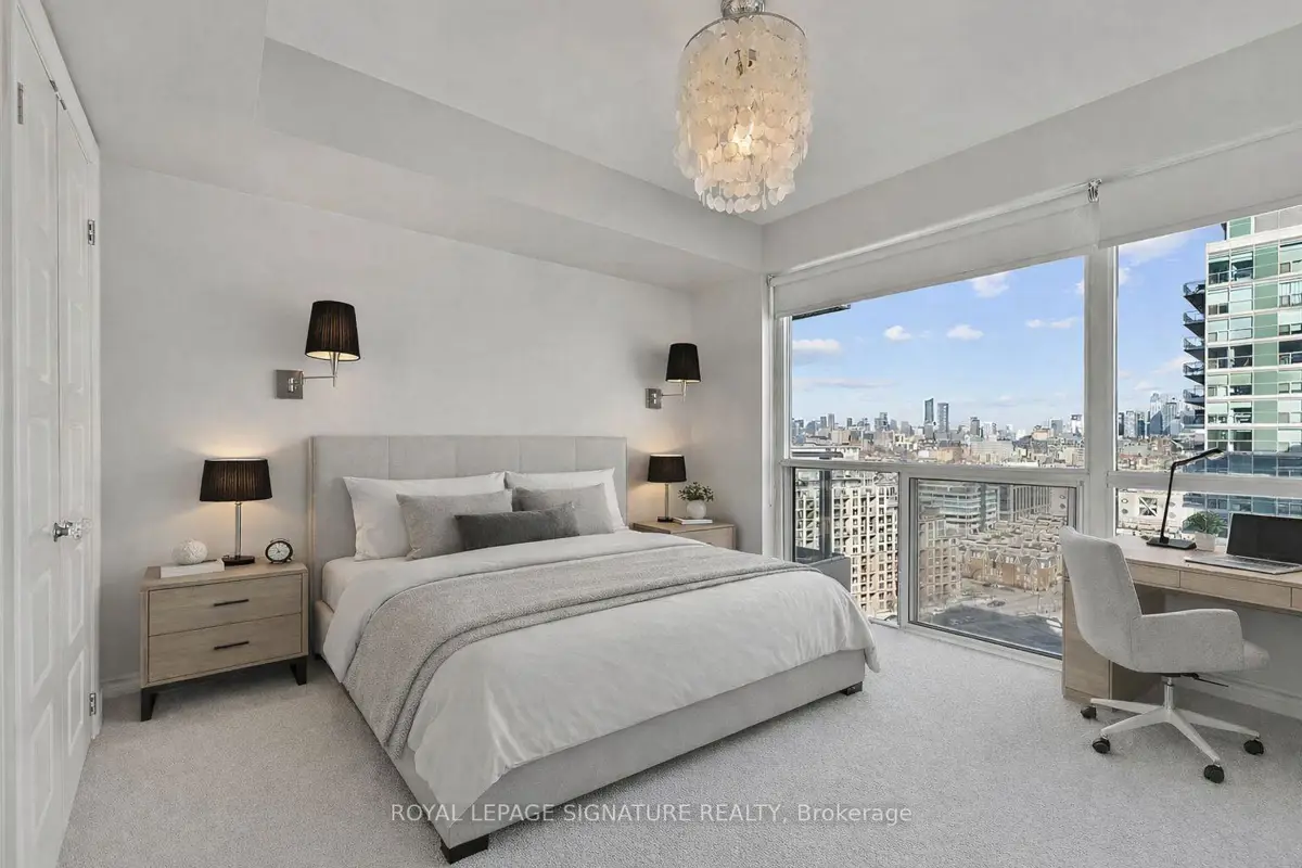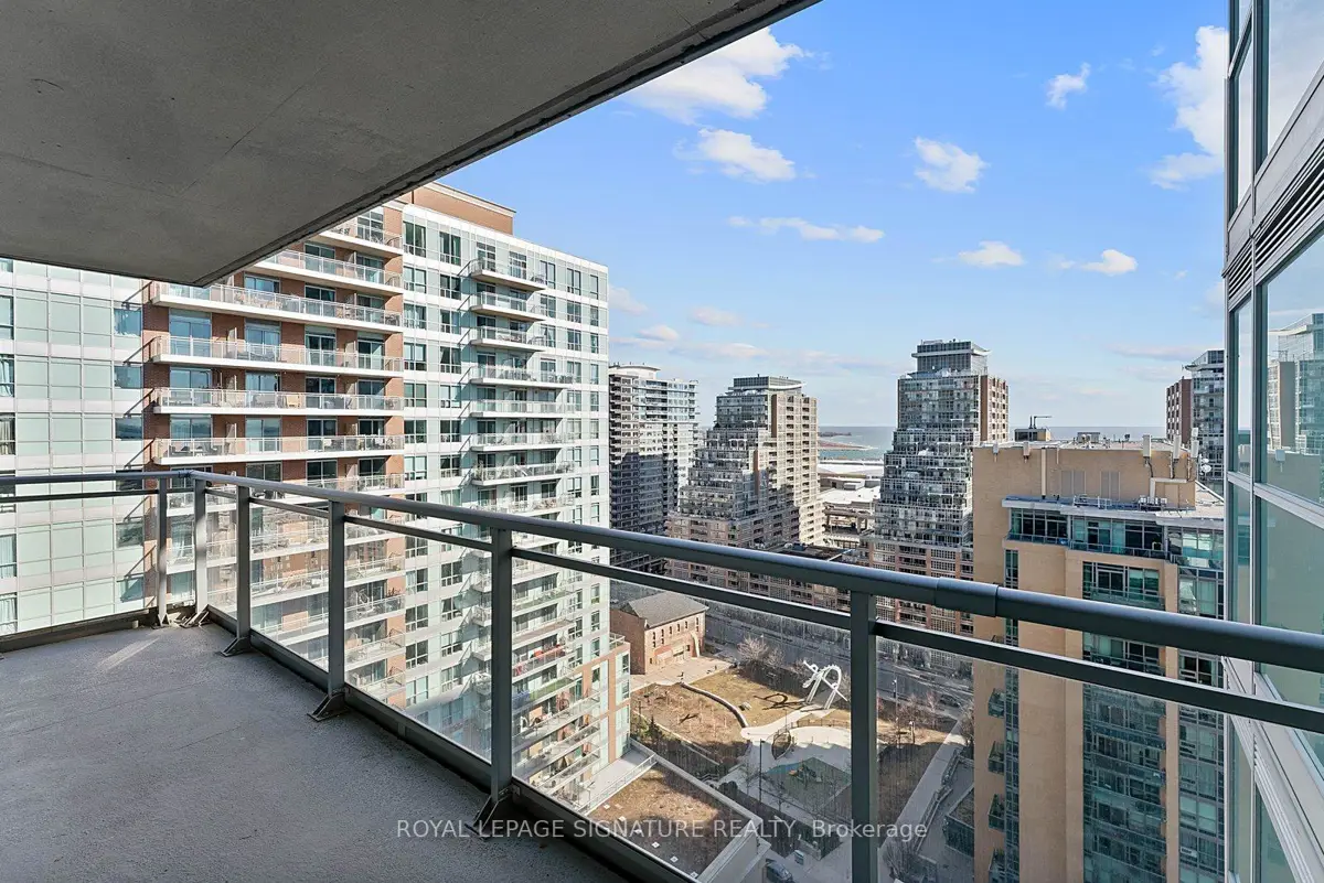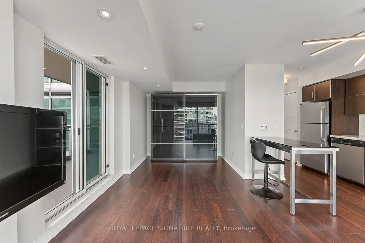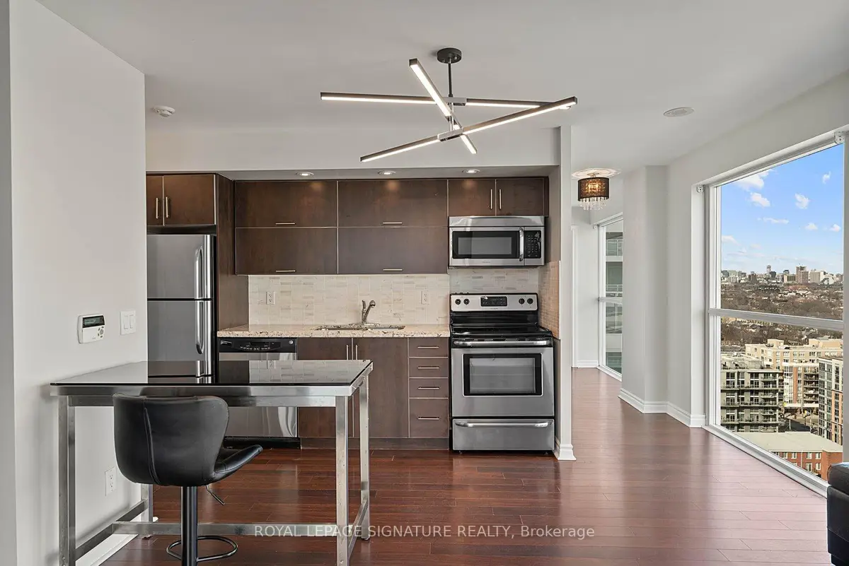 Experience stunning, postcard-worthy views of Lake Ontario and breathtaking sunrises from this thoughtfully designed 1-bedroom + den corner suite - featuring a functional split layout with no wasted space! Freshly painted throughout and professionally deep cleaned, offering a pristine, move-in ready space. Floor-to-ceiling windows line the entire south and east wings of this unit, flooding the space with natural light while framing panoramic lake and city skyline views. The modern eat-in kitchen is equipped with granite countertops, a subway tile backsplash, and full-sized stainless steel appliances. The bright living and dining area easily accommodates a full dining table and entertainment setup, making it ideal for both everyday living and hosting. Walk out to the expansive 111+ sqft balcony that spans the entire south side of the suite, creating a seamless indoor-outdoor living experience. The open-concept den, located just off the main living/dining space, features an IKEA PAX storage system and is perfectly suited for a comfortable work-from-home setup. Privately positioned at the end of the hallway, the spacious primary bedroom, with freshly professionally cleaned carpet, offers floor-to-ceiling windows and a spacious walk-in closet. The 4-piece spa-inspired washroom has a freshly re-caulked 2-in-1 shower/soaker tub with hand-held wand, stylish tile floors, a mirrored medicine cabinet, vanity with under-sink storage and wall-mounted mirror. Sheer roller blinds in the living/dining/kitchen were professionally cleaned. Includes one parking space and a storage locker! World-Class Amenities in 3x Buildings: 3x Gyms, Indoor Pool, Whirlpool Hot Tub & Steam Rooms, Landscaped Outdoor Lounge Area with Bbq's, Sports Lounge with Billiards Table, Party Room, Theatre Room, Meeting Rooms, Guest Suites & Concierge In 50 Lynn Williams. Steps To Pedestrian Bridge!
