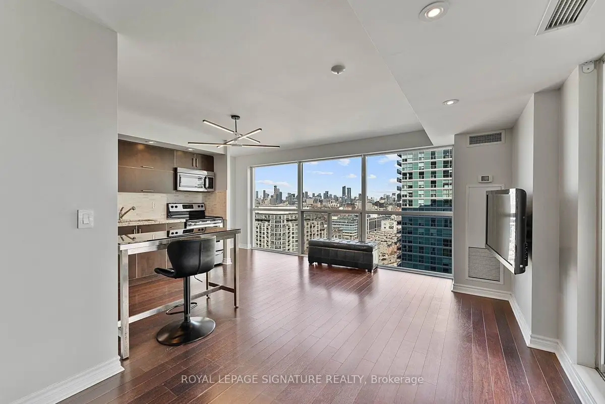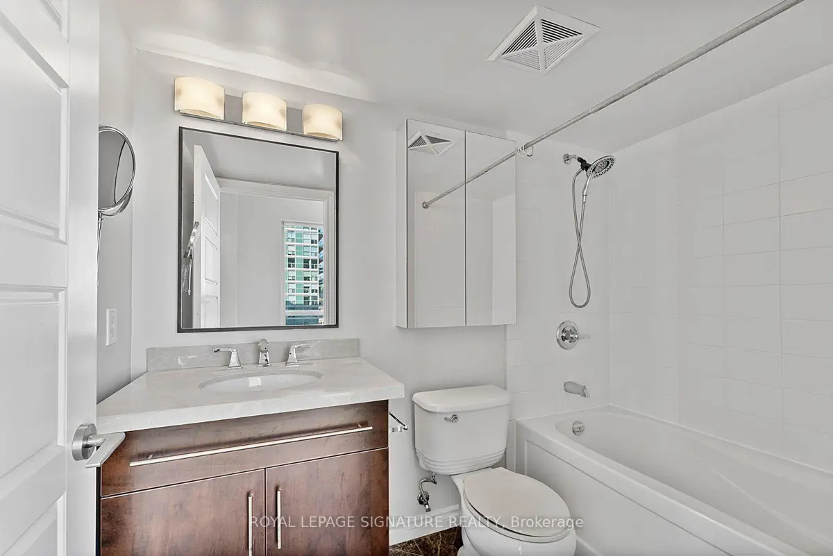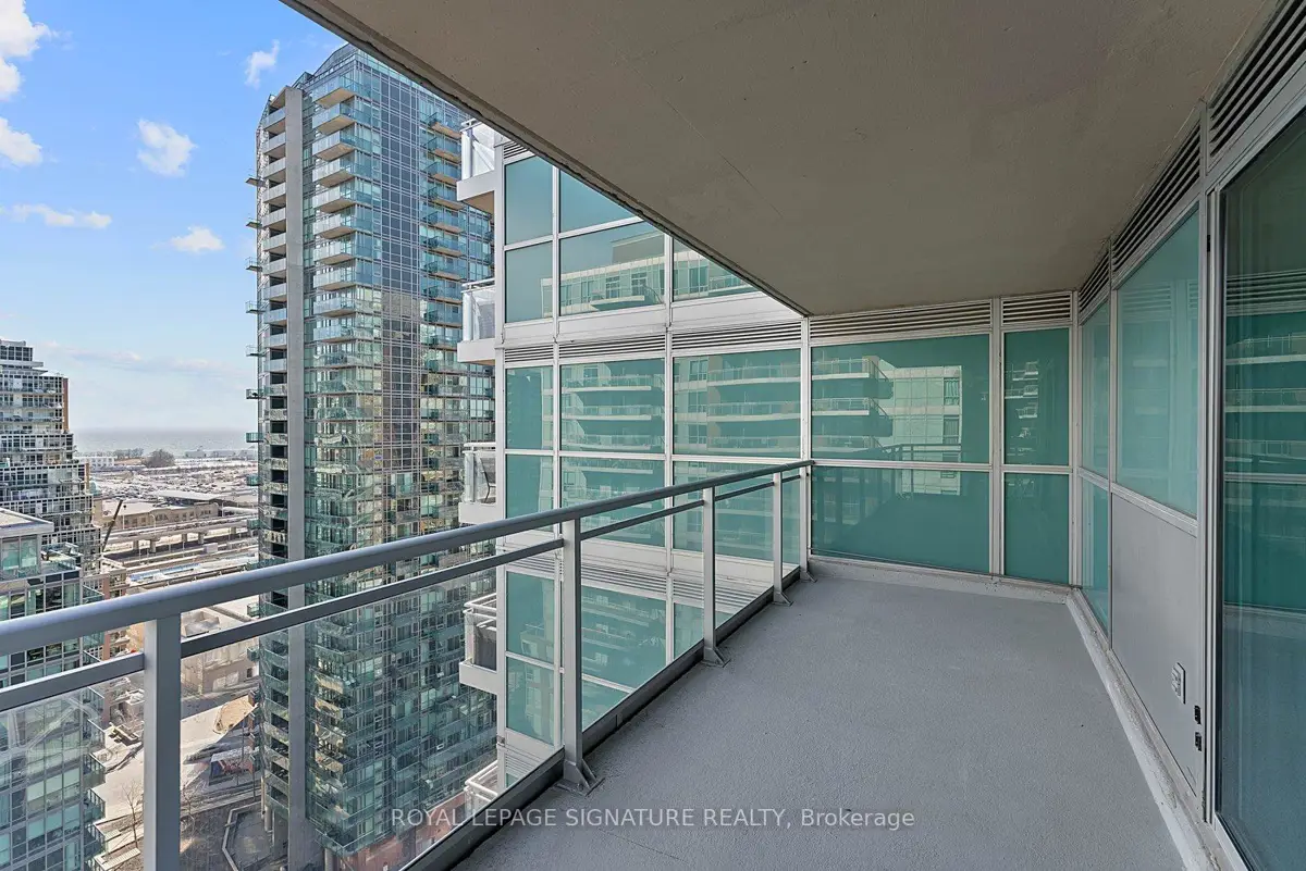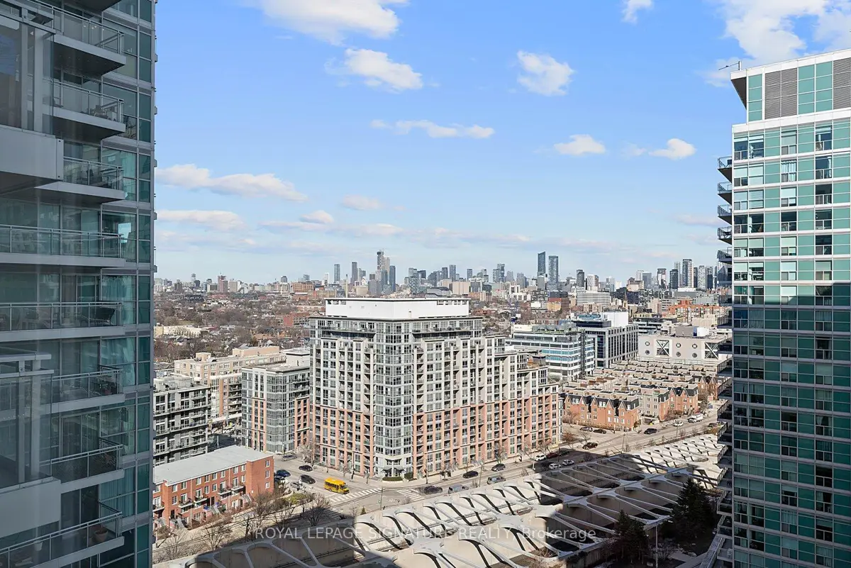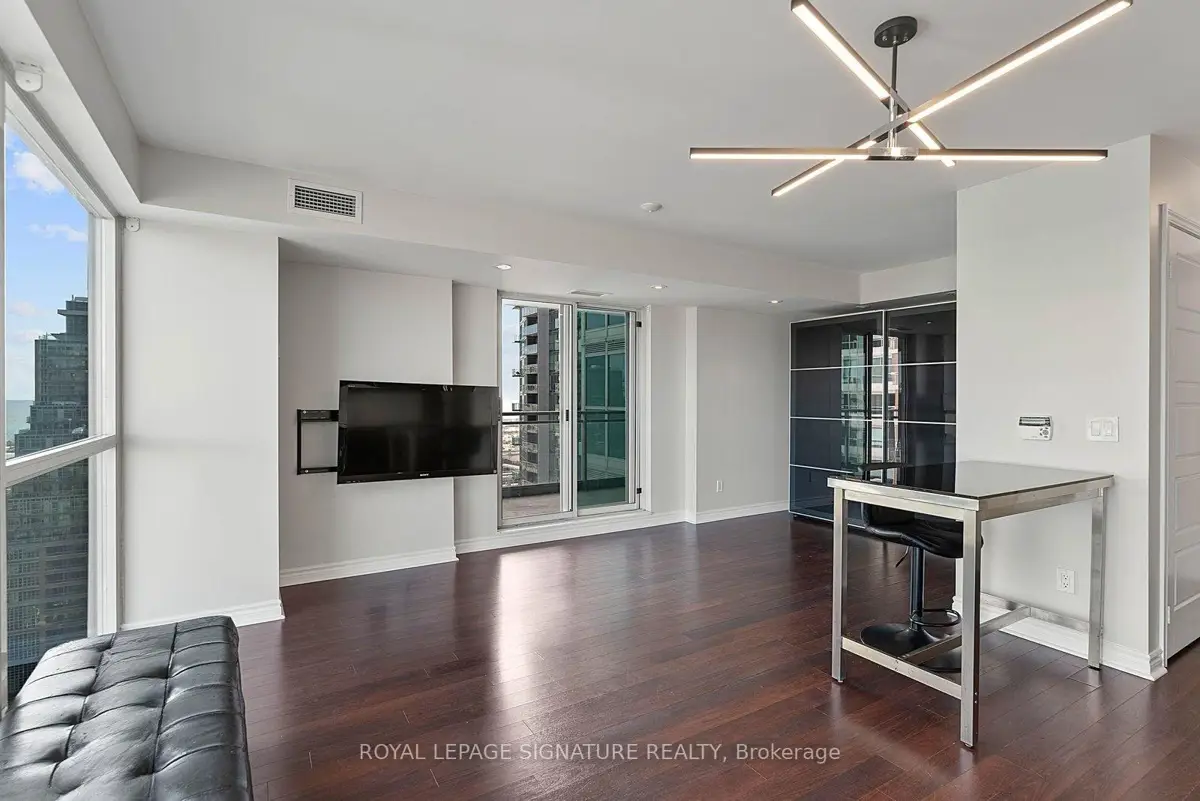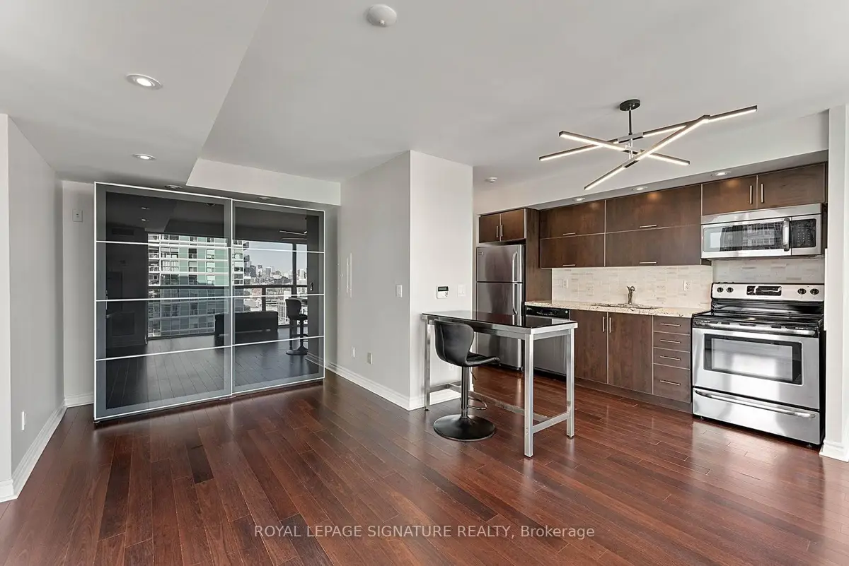 Experience stunning, postcard-worthy views of Lake Ontario and breathtaking sunrises from this thoughtfully designed 1-bedroom + den corner suite - featuring a functional split layout with no wasted space! Freshly painted throughout and professionally deep cleaned, offering a pristine, move-in ready space. Floor-to-ceiling windows line the entire south and east wings of this unit, flooding the space with natural light while framing panoramic lake and city skyline views. The modern eat-in kitchen is equipped with granite countertops, a subway tile backsplash, and full-sized stainless steel appliances. The bright living and dining area easily accommodates a full dining table and entertainment setup, making it ideal for both everyday living and hosting. Walk out to the expansive 111+ sqft balcony that spans the entire south side of the suite, creating a seamless indoor-outdoor living experience. The open-concept den, located just off the main living/dining space, features an IKEA PAX storage system and is perfectly suited for a comfortable work-from-home setup. Privately positioned at the end of the hallway, the spacious primary bedroom, with freshly professionally cleaned carpet, offers floor-to-ceiling windows and a spacious walk-in closet. The 4-piece spa-inspired washroom has a freshly re-caulked 2-in-1 shower/soaker tub with hand-held wand, stylish tile floors, a mirrored medicine cabinet, vanity with under-sink storage and wall-mounted mirror. Sheer roller blinds in the living/dining/kitchen were professionally cleaned. Includes one parking space and a storage locker! World-Class Amenities in 3x Buildings: 3x Gyms, Indoor Pool, Whirlpool Hot Tub & Steam Rooms, Landscaped Outdoor Lounge Area with Bbq's, Sports Lounge with Billiards Table, Party Room, Theatre Room, Meeting Rooms, Guest Suites & Concierge In 50 Lynn Williams. Steps To Pedestrian Bridge!