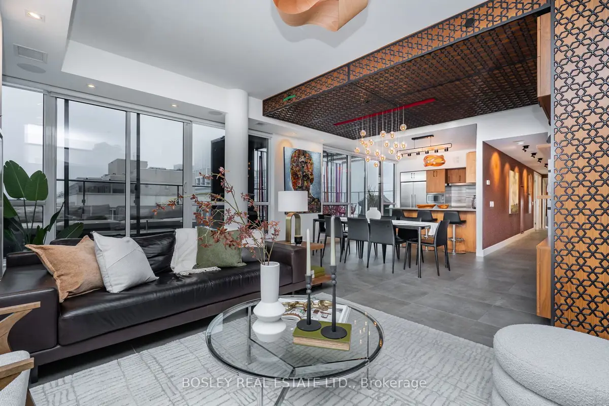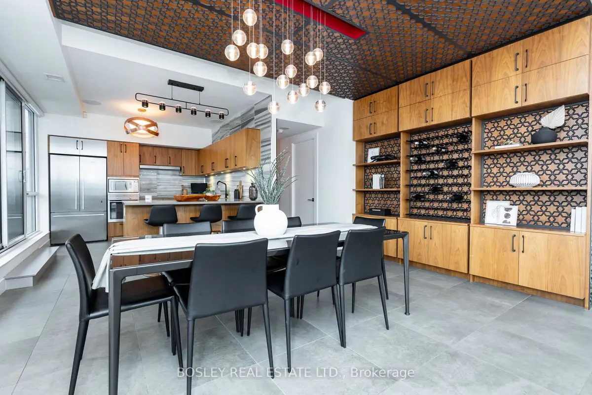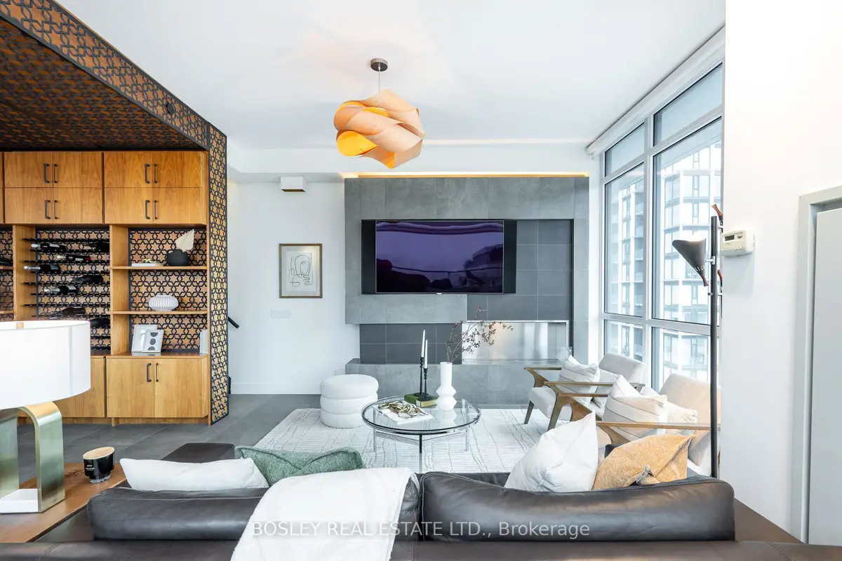 In a city full of cookie-cutter condos, this residence stands apart - an example of architecture applied to everyday living. Welcome to PH1606 at Kings + Condos, a custom-designed two-level urban residence offering nearly 2,000 sq ft of interior living space plus two private terraces and 2 balconies. This home blends architectural design, intelligent technology, and elevated comfort. The interior was custom designed in collaboration with Wanda Ely Architects and features bespoke millwork in the dining room, a custom media wall with Ecosmart fireplace, and exceptional storage including custom dressing spaces, a dedicated walk-in wardrobe, and built-in jewelry and shoe cabinetry. A fully integrated Savant smart home system powers distributed audio throughout the residence, including bathrooms and the lower terrace, while controlling televisions and lighting seamlessly throughout the home. The kitchen is designed for both everyday living and entertaining, featuring an enlarged refrigerator, 5-burner cooktop, and a full walk-in pantry. A rare full laundry room with oversized sink adds an additional layer of functionality seldom found in downtown residences. Outdoor living has been elevated through two professionally designed terraces by Earth Inc.. The lower terrace features custom stone flooring, lighting, gas and water connections, and wired sound. The upper terrace offers custom wood flooring and a gas-line firepit - creating true outdoor rooms rather than typical condo balconies. Each room features its own thermostat for personalized heating and cooling, and the suite includes a private A/C unit independent from the building, allowing cooling year-round. Perfectly positioned for urban convenience with quick access to both the Gardiner Expressway and Don Valley Parkway. Walk to groceries, shopping, and some of the city's best dining. This residence isn't just about space, it's about living an elevated lifestyle in the heart of Toronto.