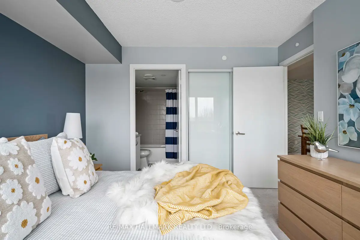Fabulous bright and spacious 2 bedroom plus den corner unit with one of the most desirable layouts in Danforth Village Estates! This lovely space spans 882 square feet and has everything you'll need in a condo. Natural light floods the open concept living areas, and with its southwest exposure, there are fantastic views of mature greenspace from every window and the large balcony. The primary bedroom features a full ensuite bathroom to go along with loads of closet space. There's a second full 4 piece bath, ensuite laundry, underground parking, and a locker. Excellent location with public transit at the door, close to parks, and many amenities. This is amazing value and a great opportunity for starters or investors looking for something that isn't that cooker-cutter shoebox. Lots of space to spread out for a couple and/or a small family.