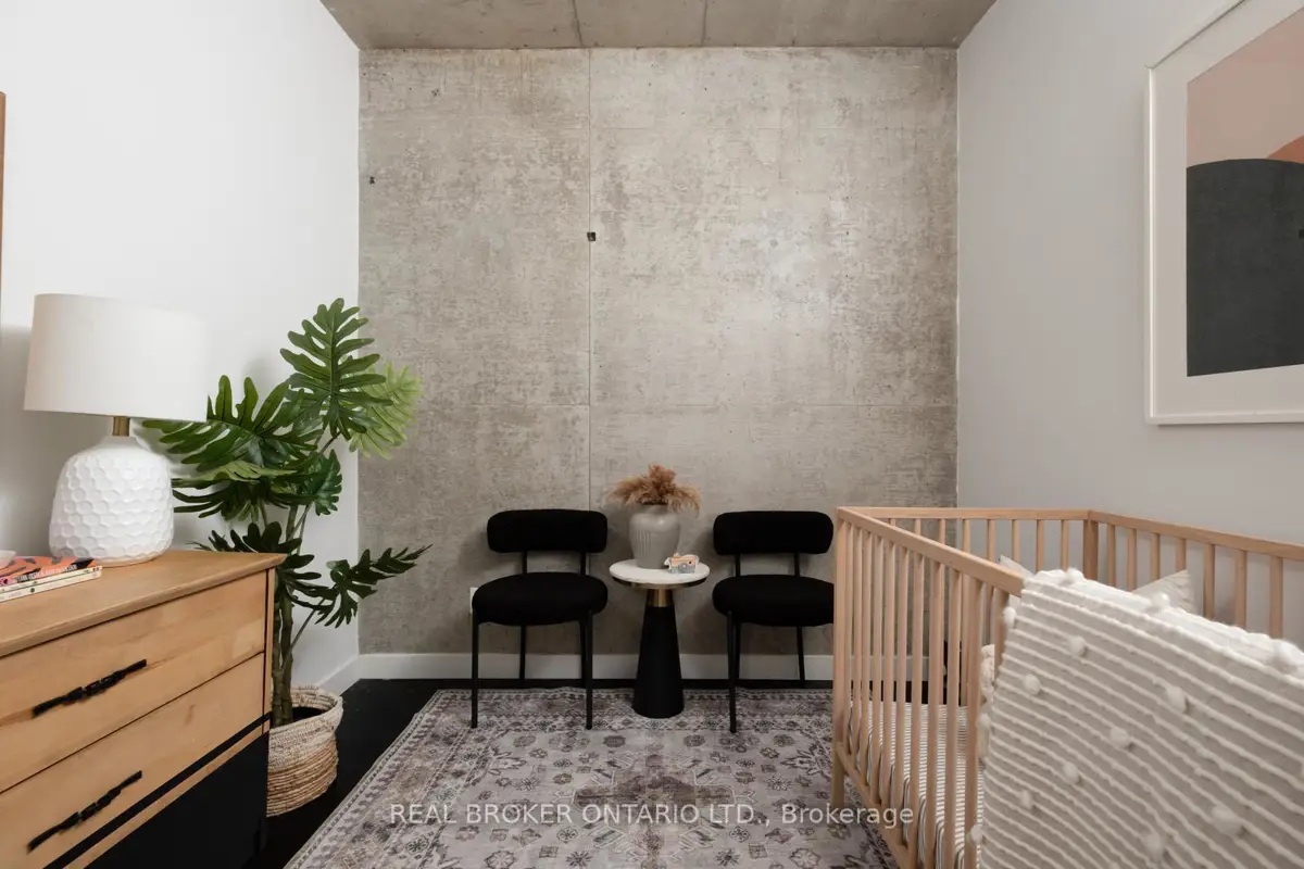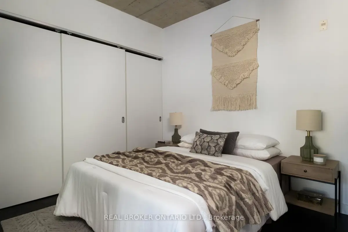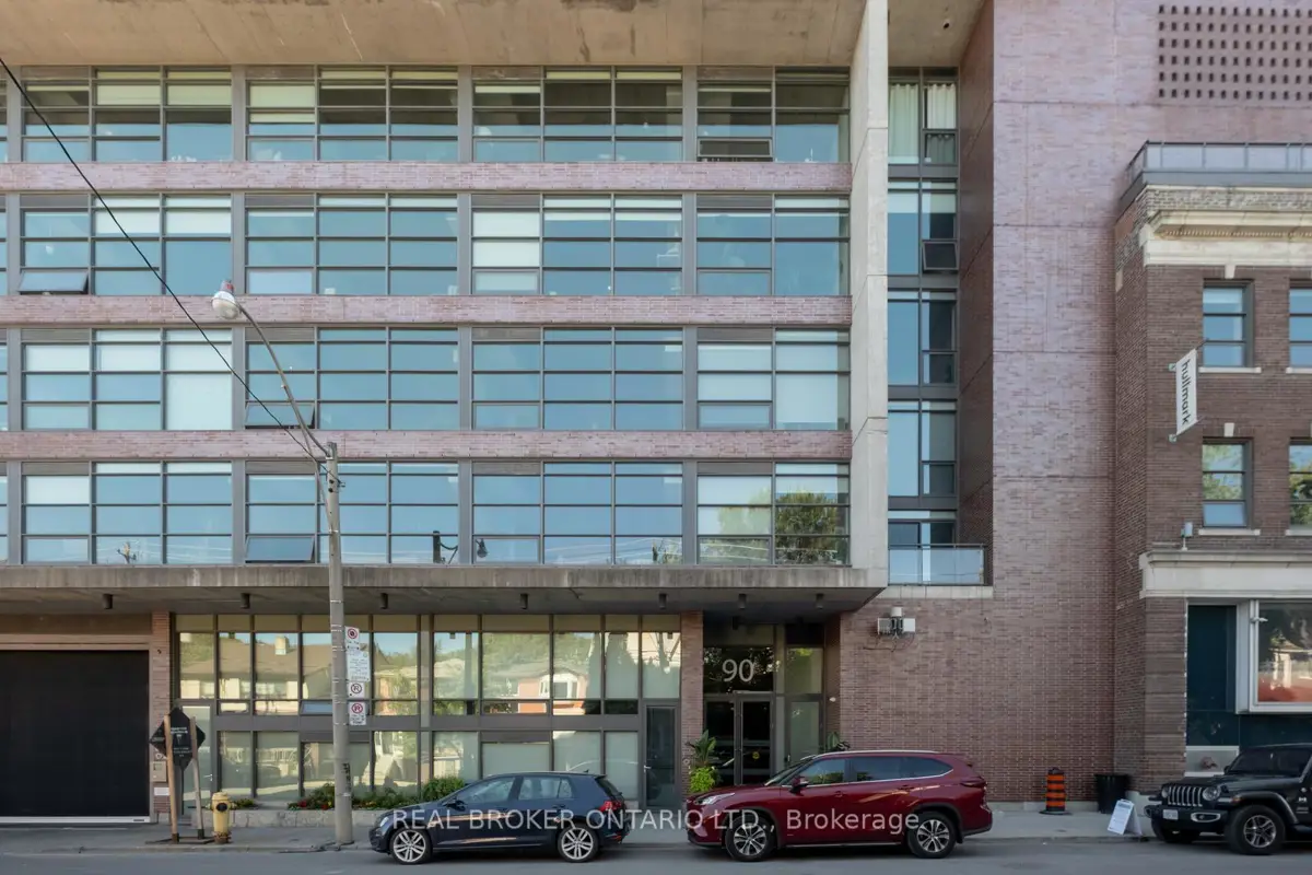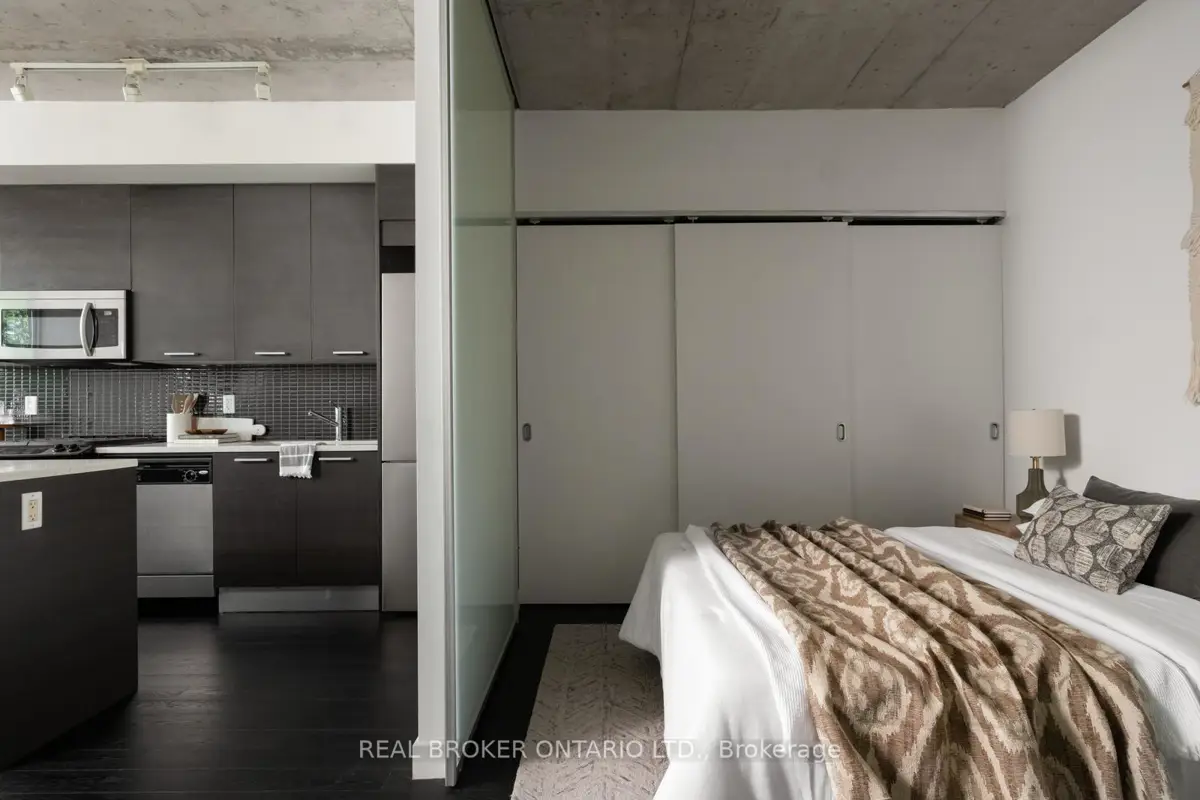 Welcome to The Ninety, a boutique loft residence where contemporary design meets authentic urban character. This thoughtfully designed 1+den suite showcases exposed concrete walls and ceilings, hardwood flooring, stainless steel appliances, and a seamless open-concept layout ideal for modern living.The generous den offers exceptional flexibility-perfect as a second bedroom, home office, or creative space-while expansive wall-to-wall windows flood the living area with natural light, enhancing the home's bright, airy atmosphere. Renowned as one of Toronto's most sought-after boutique loft buildings, The Ninety blends historic charm with modern finishes and offers desirable amenities including a landscaped courtyard terrace, party room, and concierge service. Ideally located in the heart of Riverside/Leslieville, you're just steps from Queen Street East's cafés, restaurants, shops, parks, and trails, with convenient access to transit and major highways.