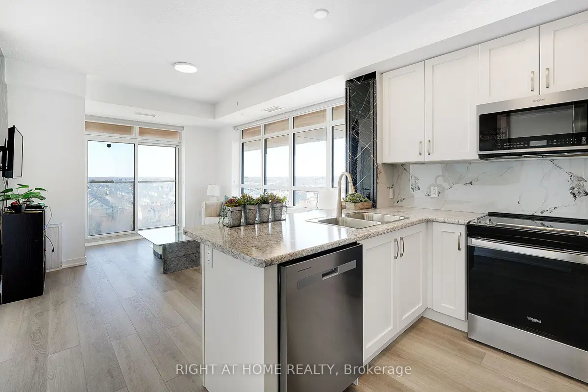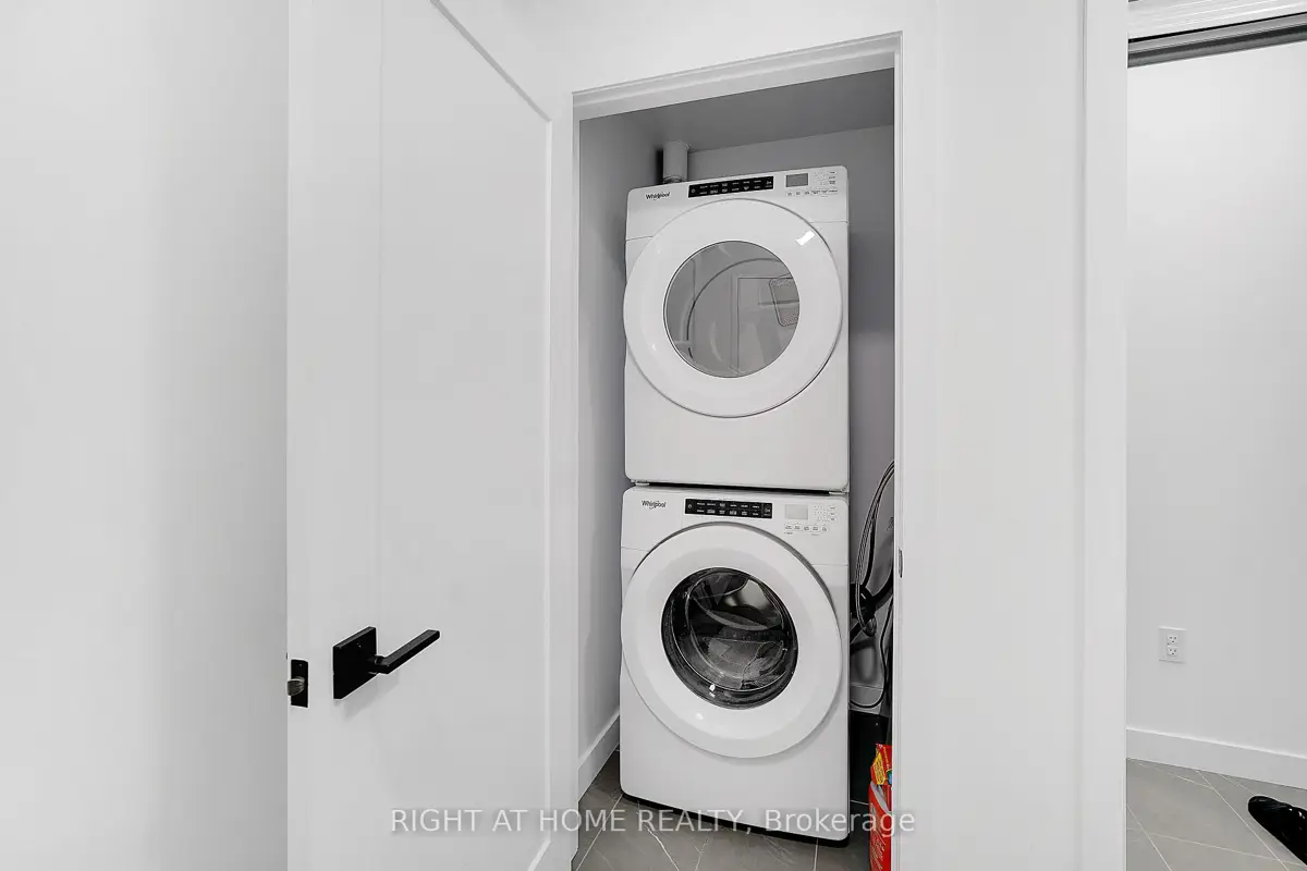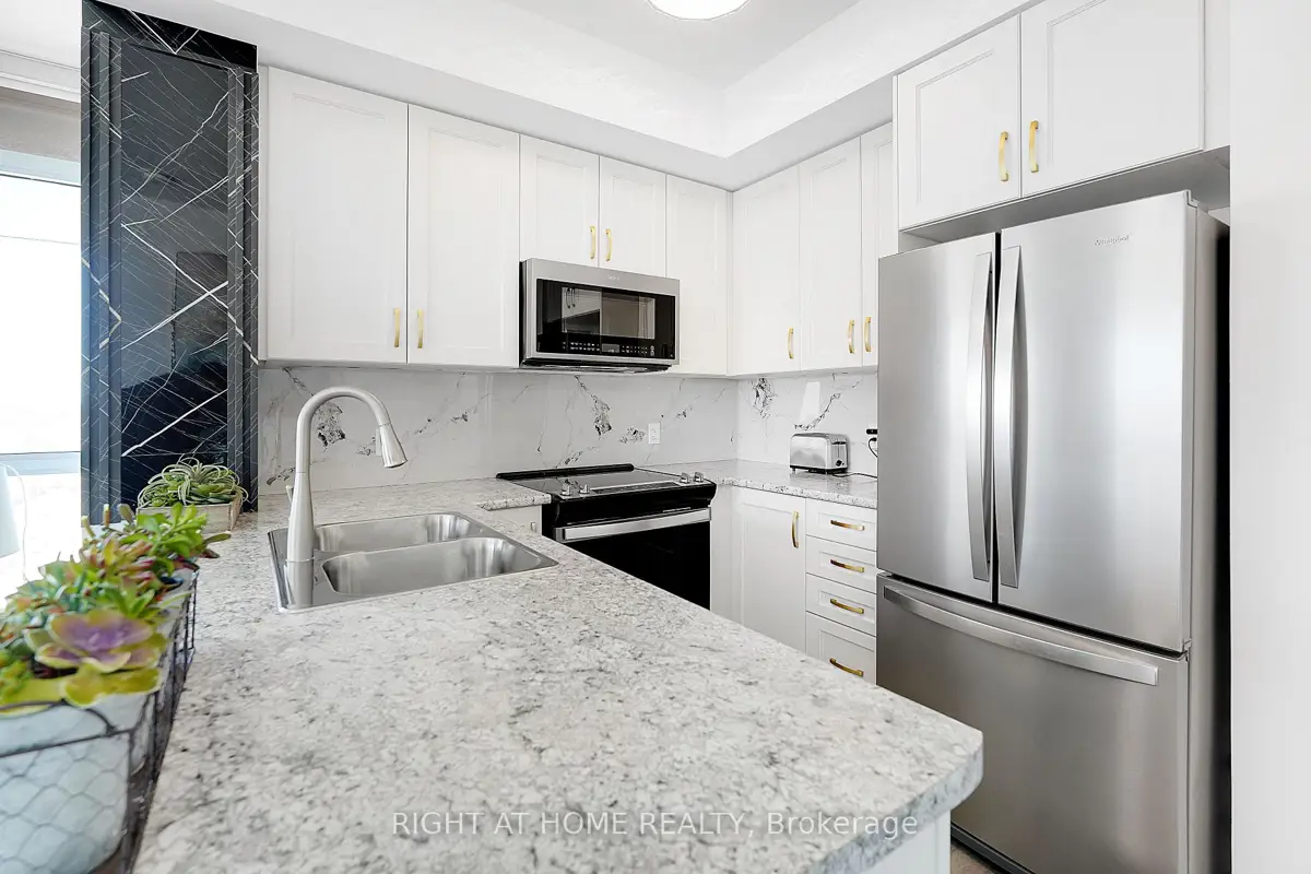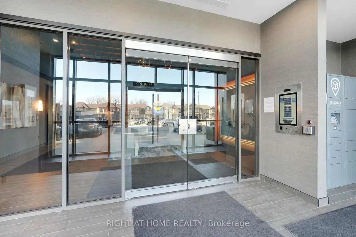 Modern Trend Living condo with 9-ft ceilings and an open-concept layout. Features ceramic tile flooring and bright LED lighting throughout. The stylish kitchen offers custom cabinetry, designer faucet, and laminate countertops with a backsplash, while the bathrooms boast quartz countertops and spa-inspired premium fixtures. Enjoy a feature wall for your TV, a French balcony, and an owned locker for extra convenience. Pet-friendly in both living areas and bedrooms. This energy-efficient building includes geothermal heating/cooling, secure entry, 2 owned underground parking spaces, rooftop terrace, and professional management. Freshly painted and perfectly located near parks, shopping, restaurants, and major highways.