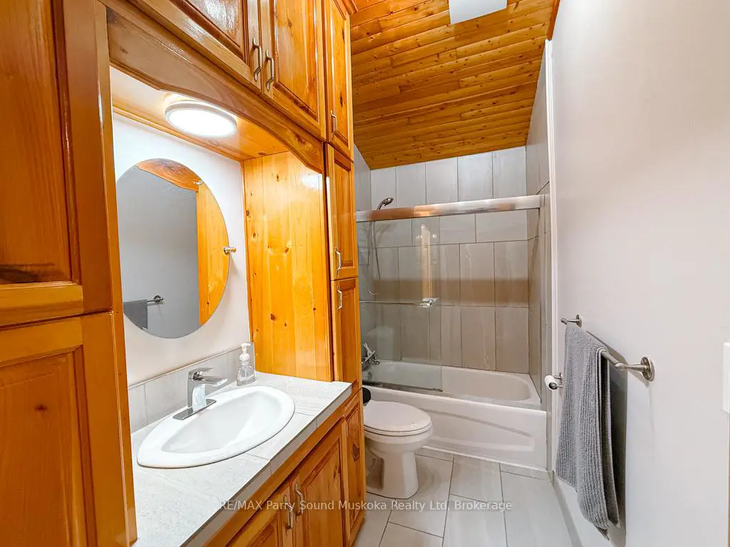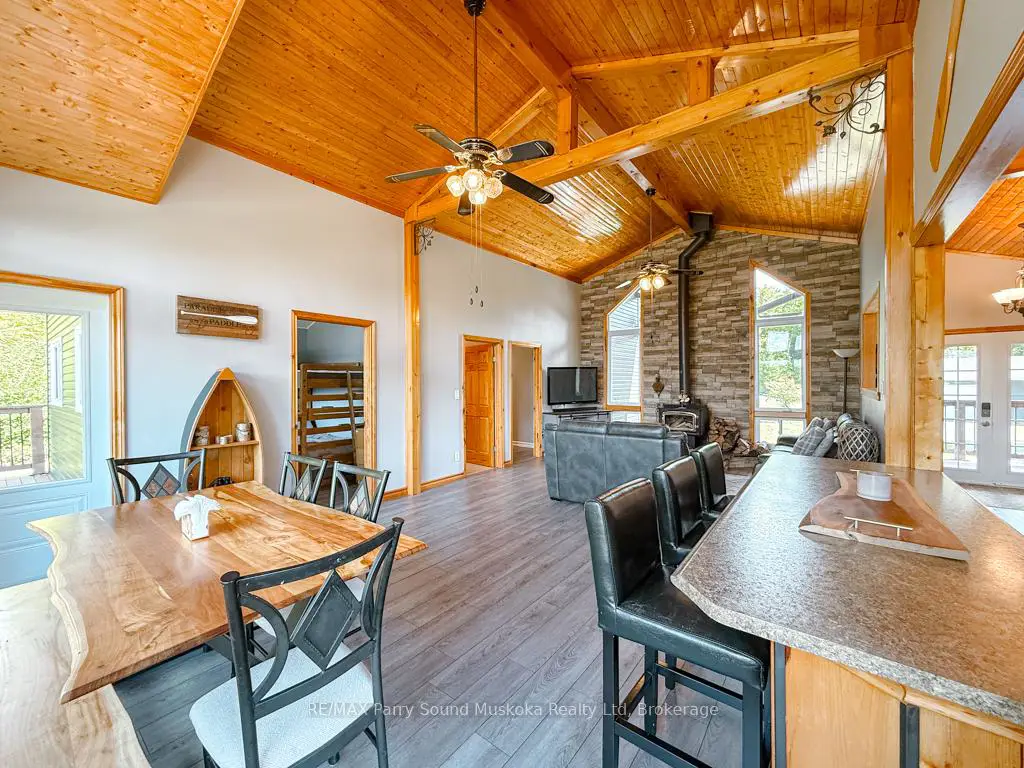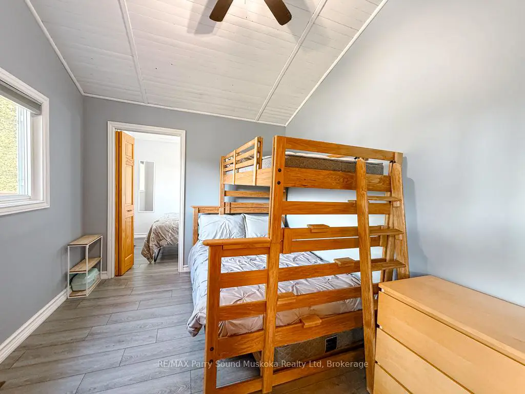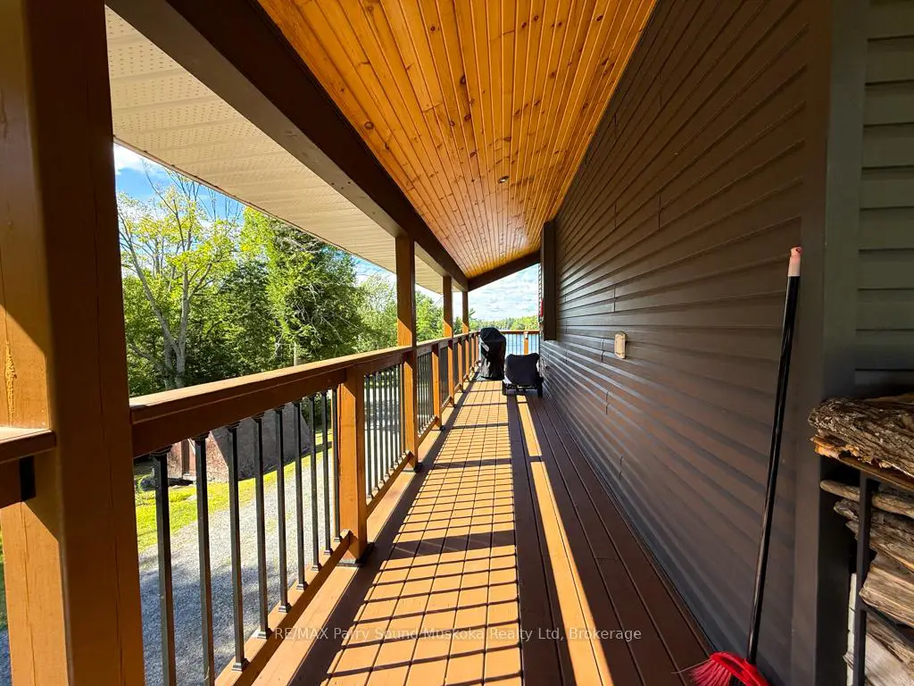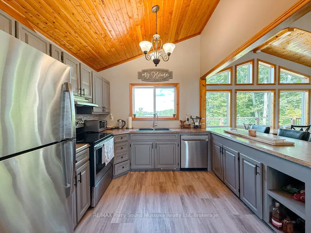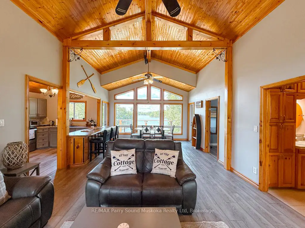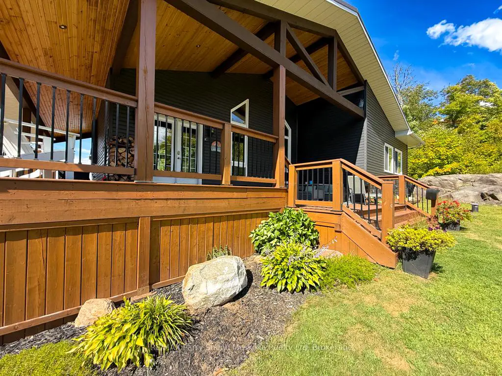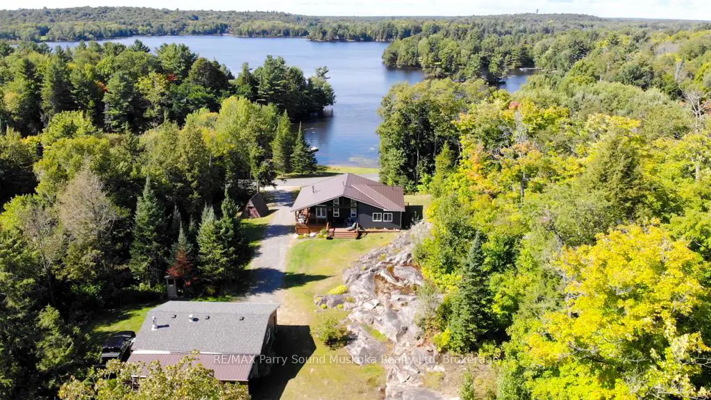 Turnkey Lake Manitouwabing Four-Season Bungalow. Discover this recently renovated bungalow situated on 1.1 acres with 238 feet of waterfront along a quiet bay on Lake Manitouwabing. Enjoy the beauty of nature right in your backyard or at the sandy beach, where the Canadian Shield has been thoughtfully incorporated into the landscaping and gardens. This spacious home offers three bedrooms plus a den and two 3-piece bathrooms. The open-concept great room/ dining room, and kitchen create a welcoming atmosphere, enhanced by beautiful views from the wraparound deck. Walkouts to both the front and back decks allow for easy indoor-outdoor living. The covered porch provides an ideal space for barbecuing or entertaining, even on rainy days. Inside, the house boasts vaulted ceilings, a galley kitchen with a breakfast bar, a wood-burning stove, and a forced-air propane furnace to keep you comfortable on cool or wintery nights. Outside, there is a large garage and workshop, as well as ample parking to accommodate family and guests. The sandy beach waterfront features a Bunkie for additional guest accommodation, a firepit, and storage space for recreational equipment. There is also a dock for boating and swimming. The quiet bay, located just off Burnett's Bay, connects to kilometers of water for boating, exploring, tubing, waterskiing, or fishing on this scenic finger lake. Take a short boat ride or drive to Tait's Landing Marina for family treats like ice cream. Golf enthusiasts can visit the Ridge of Manitou Golf Course during the spring, summer, and fall. In the winter, the area transforms into a playground for ATV riding, snowmobiling, ice fishing, snowshoeing, and cross-country skiing. The property is conveniently located just twenty minutes from the McKellar Market and Parry Sound, making shopping and amenities easily accessible.